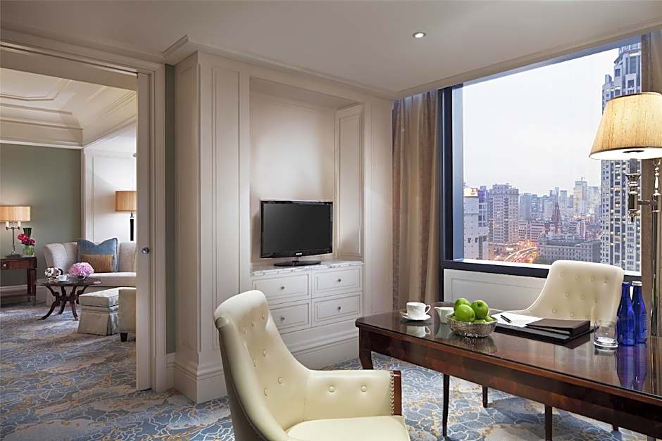 Guests can enjoy sweeping views of the Bund and the city skyline from this luxurious suite, which offers a separate bedroom with king-sized bed, a living area and a marble bathroom with double vanities and a bathtub. Other features include a walk-in wardrobe and a flat-screen TV.